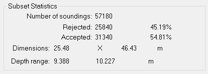| Each time a subset is generated, the following information is displayed: • total soundings in the current subset • number and percentage of soundings with Accepted and Rejected status • dimensions of the subset • minimum and maximum depth levels within the range of the subset.