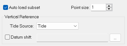 Vertical Reference | Data can be shifted vertically using either a tide or a currently open surface to visually change the data in the display. (No changes are made to the stored data.) Use Tide Source to generate final depths relative to a tide datum by subtracting the tide values from the sounding depth. Use an open surface or an open XYZ file to shift using a grid of datum heights. 1. Select the Datum Shift check box and click Browse to open the Select Surface dialog box. 2. Select a surface to use from the list of open surfaces. Click OK. |