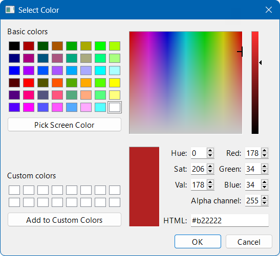 Attributes that are based on a set of named values (such as Detection Type and Multiple Frequencies) have a specific colour for each value. These default colours can be changed by selecting a colour in the widget and choosing another colour from the colour picker.