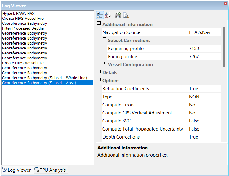 When the process is run and the corrections are applied, an entry will be added to the Log Viewer for each method that Georeference Bathymetry was run, both Subset - Area' and 'Subset -Whole Line', for only the subset area. The entry will include the start and end profiles of the subset for which the data was processed. It will also display the options that were used when Georefence Bathymetry was run. By default, the Refraction Coefficients and Depth Corrections options are enabled when run from the Subset Editor.