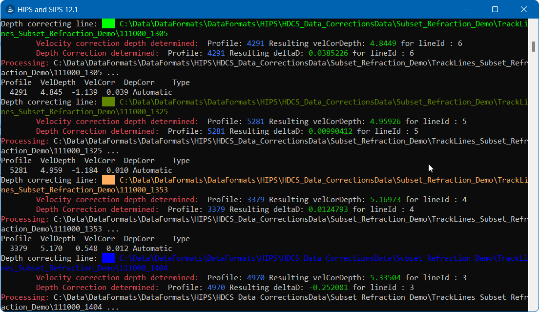 The Console window is also available as an advanced method of monitoring the corrections when running automatic corrections. This window can be opened by enabling the Tools > Options > General > Console setting. Details about the corrections will be displayed in this window as the corrections are added. The details will be colour coded to match the colours being used to display each track line in the 2D and 3D View windows, making it easy to identify which track line the correction was added to.