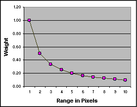 The following graph demonstrates range weighting using distance from a node in units of pixels (multiples of the surface resolution).