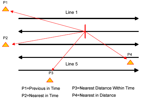Nearest Distance Within Time: Select the profile with a position nearest to the swath and has a time stamp nearest the time of the swath within a selected range.