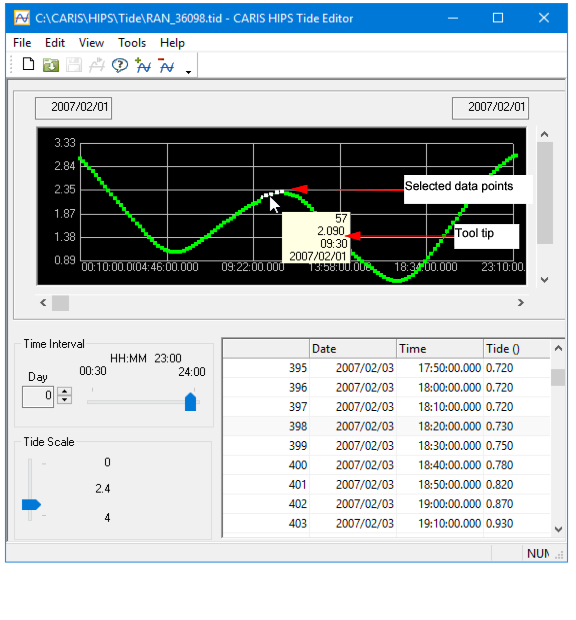 The tide file is displayed in the editor.The top part of the editor shows a tide versus time graph of the data. Tide-level values are represented on the vertical axis. Time is represented on the horizontal axis. These can be adjusted using slider controls.