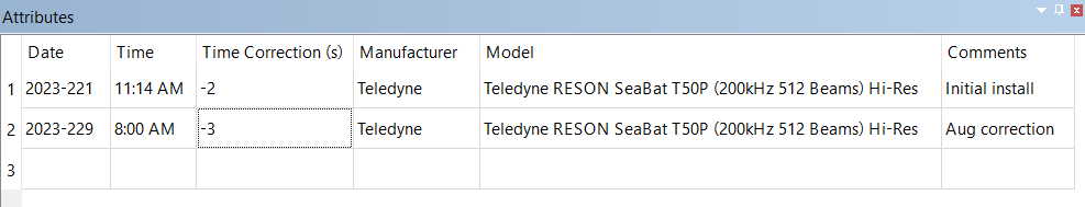 Vessel Editor assumes that these attributes can change over time, such as if you change the vessel’s waterline, move sensors, or switch to another TPU model. To account for this, the attributes are listed in a table where each row indicates a different set of attributes for the component. These rows have time stamps (the Date and Time fields) that indicate when that set of attributes should start being used. When HIPS and SIPS uses the vessel file for data processing, it uses the attributes from the row whose timestamps correspond to the time of the survey.