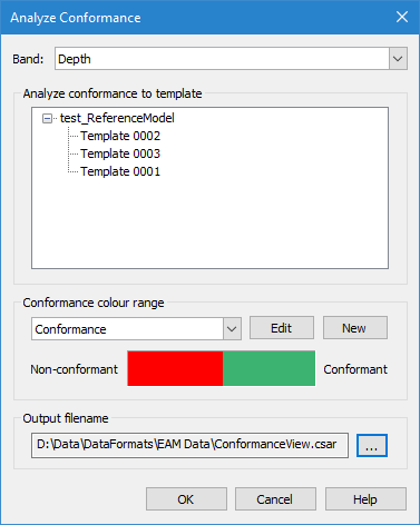 You are returned to the Conformance Analysis dialog box. The new file is displayed in the drop-down list and the colour bar is adjusted to represent the new range values.