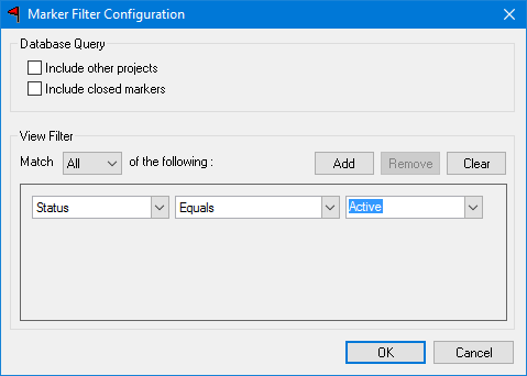 Database Query | Include other projects • On: The search will include multiple projects. • Off: The search is restricted to the current project. Include closed markers • On: The search will include closed markers. • Off: The search will not include closed markers | |