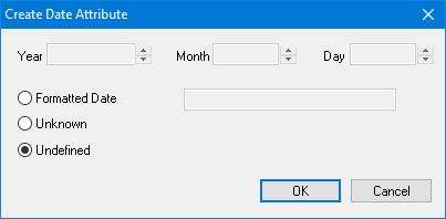 3. Select one of the following options: • Formatted Date: Define the actual date. Change the Year, Month, and Day options using the arrow buttons. The formatted date is displayed in the box. • Unknown: The date is unknown. • Undefined: The date is not defined. 4. Click OK. You are returned to the Attributes dialog box. |
