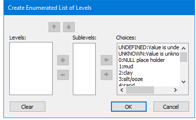 Enumerated attributes where the values can be ranked in order. Examples are the NATSUR and NATQUA attributes. Attribute values can be on an equal level or in a hierarchy. Values on an equal level are separated by a comma. A surface that contains both mud (1) and shells (17) is shown as | 1. Select the attribute. 2. Click browse ( The Create Enumerated List of Levels dialog box is displayed.
