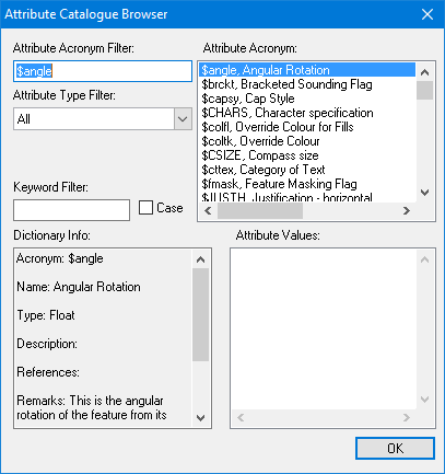 Attribute Acronym | The list of acronyms. This list changes as you use the filter options. Click on a item in this list to display its data in the Dictionary Info box. |