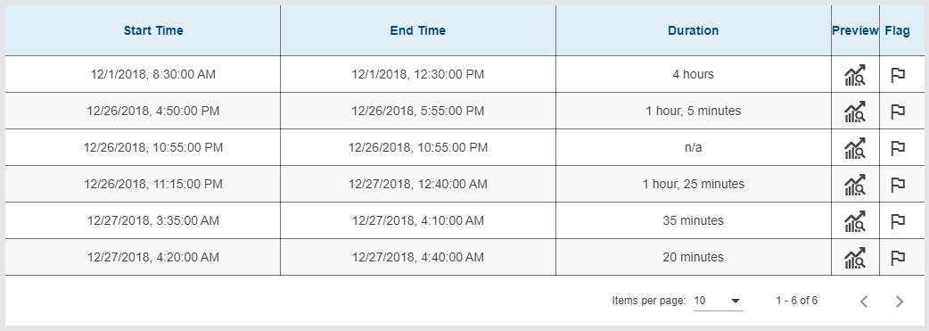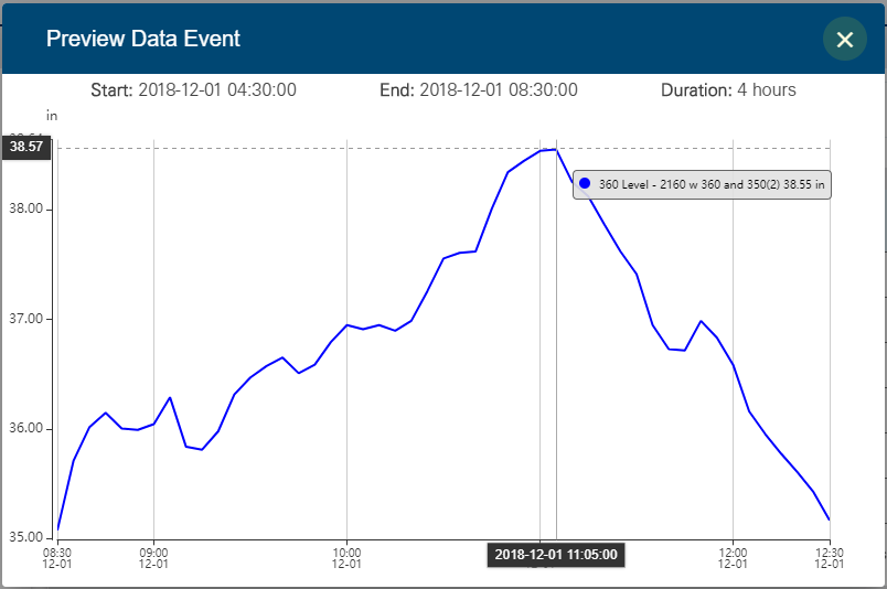 The preview includes the start and end times during which the data was at the specified conditions and the duration of that period. The preview can zoomed in or out using the middle mouse wheel. As the cursor is moved over the data in the preview, a tooltip will be displayed with details of the data at the current location.