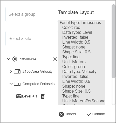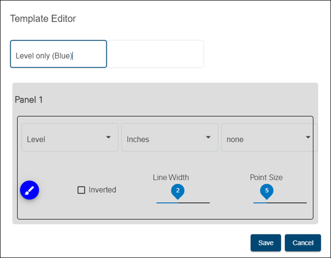 This dialog box provides fields to change the Title and Description of the template. It also provides a section of properties for each panel in the template. The properties that can be changed for each panel include dataset type, units, point symbol shape, point size, color, line width and a switch to invert the dataset in the graph.