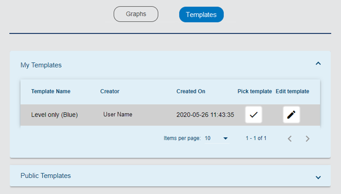 The Templates screen of the Analysis page provides templates that can be used to create new graphs. The available templates are provided in expandable lists. One list, My Templates, contains templates created by the current user. The other list, Public Templates, contains templates created by other users that have been designated as public.