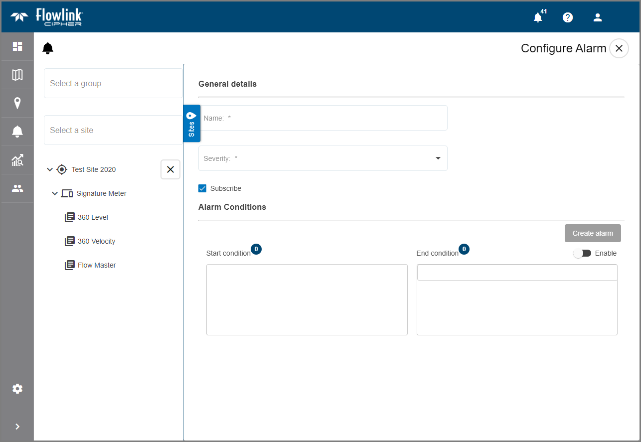 The Configure Alarm screen is used to define the settings that will trigger an alarm. A user-defined alarm alerts you to changed conditions in sensor data.