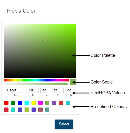 Several methods are available for selecting a color: • Color palette: Move the color slider along the color scale bar to select a general colour family and then click in the color palette to select a specific color. • Hexidecimal values: Enter the hexidecimal number of the desired color in the Hex field. • RGBA values: Enter the RGBA (red, green, blue, alpha) values of the desired color in the appropriate fields. • Predefined colours: Click one of the predefined color blocks to select that color. 2. Select a color using the various tools available in the color picker. 3. Click Select. |