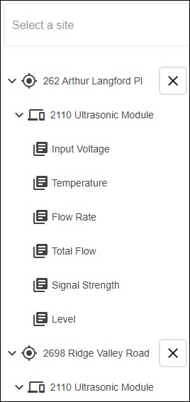 All datasets associated with the site are displayed below the site list. If the graph requires datasets from more than one site, additional sites can be selected from the site list. Each time a site is selected, the list of available datasets is added below the site list.