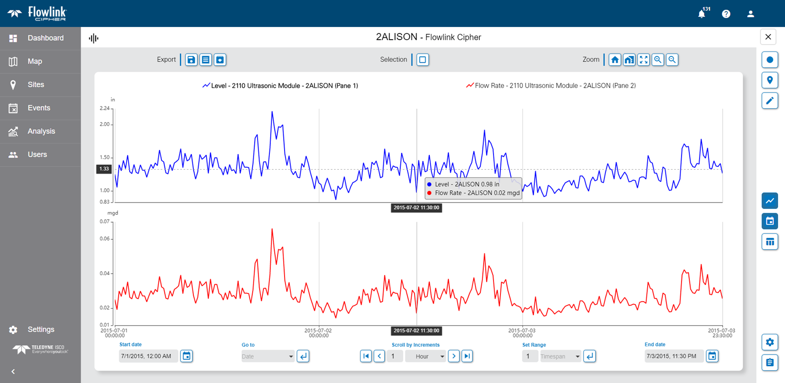 | Toggle Alarms/Events Display indicators in the graph for any events that have been created for the data. When enabled, a red icon will be added to the display for each event found. Hovering the mouse cursor over an event indicator will display a tooltip with details about the event, such as the start and end times for the event. |