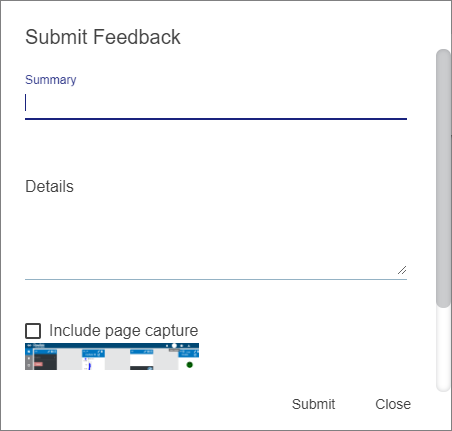 2. Type a brief description in the Summary field. 3. Type a more detailed description in the Details section. You can include a screen capture of the currently active page (for example, a graph). 4. Select the Include page capture check box. 5. Click Submit. |