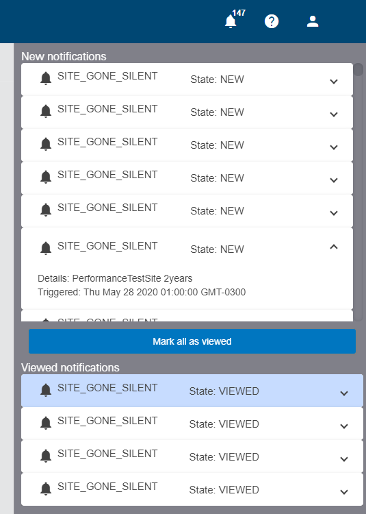 | See Notifications View site notifications received by the application. New notifications are shown as a number beside the See Notifications button when they are received by the system. For example, a single new notification would appear as shown below.