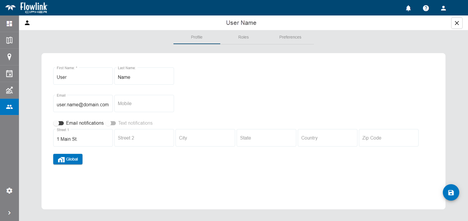 The Profile page for a user provides detailed information about the user account. This information can be viewed by all users with access to Flowlink Cipher.