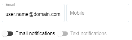 The notification toggles included in the Profile information are used to turn on/off email and/or text notifications. Email notifications is enabled by default. To enable Text notifications, the Mobile field must be populated with the phone number of a device that is capable of receiving text messages.