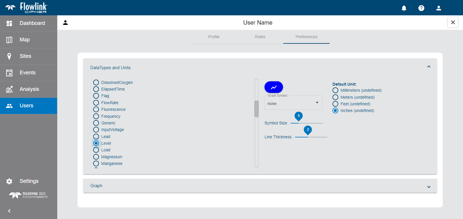 The Data Types and Units section is used to define default settings for each type of data that can be displayed in a graph. These settings will be applied automatically whenever a graph is populated with a dataset of a data type for which preferences have been selected. Different settings can be defined for each data type to provide easy identification of data when viewing a graph. The following settings can be defined: