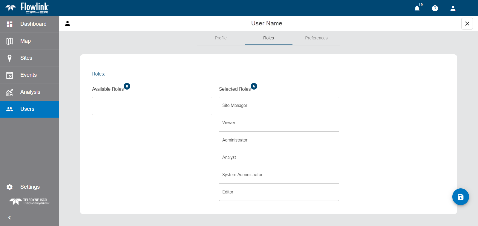 Site Manager | The Site Manager role is used to manage the sites and devices monitored by Flowlink Cipher. Users with this role have full permissions for the Dashboard, Sites and Alarms pages. The Site Manager role also has read-only access for graphs and alarms in the Analysis pages. |