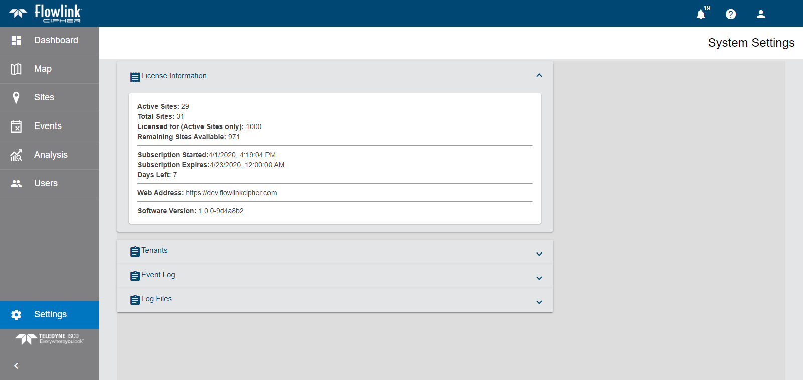 • License Information: This section provides the licensing information for the instance of Flowlink Cipher in use. This information includes: