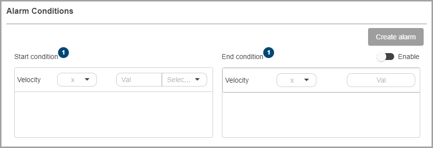 The same dataset is shown in both the Start condition and End condition fields, however, only the Start condition has an operator and value displayed. This is because, by default, the End condition is the opposite of the Start condition. If a different End condition is needed, the Enable button can be used to enable the fields in the End condition table.