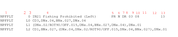 | Case numbers associated with plotting instructions, where: • 00 = specification of an unpatterned feature that will be refused by the patterning routine • 01 = plotting of an unpatterned feature with simple lines that can be patterned later • 02=plotting of a feature with simple lines that will be patterned by the patterning routine • 03 =use of plotting instructions in the line (L) subrecord • 04 = sounding • 05 = spot height • 06 = compass rose • 07 = text • 08 = point symbols • 09 = measured distance • 10 = foot bridge • 11 = viaduct • 12 = bascule • 13 = lift bridge • 14 = swing bridge • 15 = literal bridge (general) • 16 = sector light |