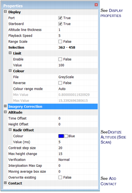 The Properties window contains controls for display, imagery correction and altitude adjustment, as well as the properties of contacts. These properties will be automatically displayed when the Side Scan Editor is opened.