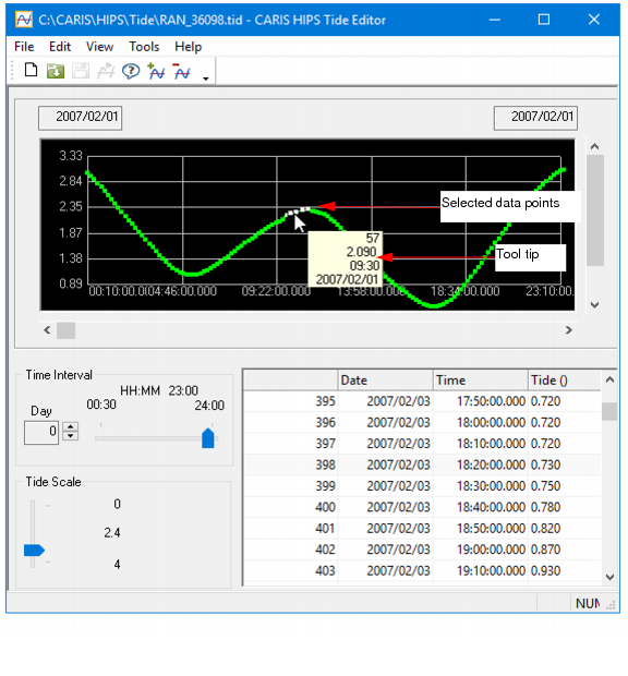 The tide file is displayed in the editor.The top part of the editor shows a tide versus time graph of the data. Tide-level values are represented on the vertical axis. Time is represented on the horizontal axis. These can be adjusted using slider controls.