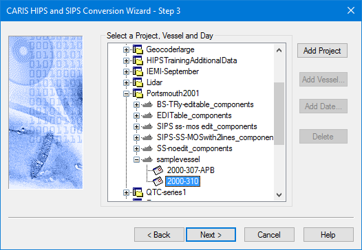 CARIS HIPS and SIPS : HIPS and SIPS Commands : Import > Conversion Wizard : Select Project, Vessel and Day