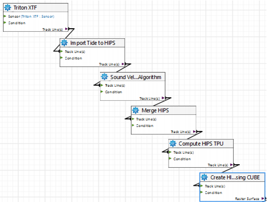 Connector | A line drawn from tool to tool to show how one function connects to the other. Connectors will not attach Input to Input or Output to output. | For example, a line from an output port labelled Track Line(s) to a Coverage input port which indicates the output data will contribute to the coverage. |