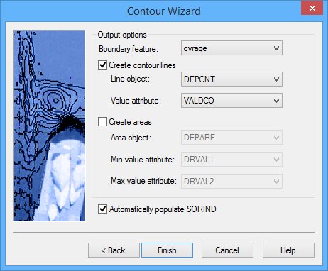 A by-product of generating contours is a bounding polygon feature, which represents the inside and outside extent of the data used to derive the contour lines. By default, this feature object is created using the cvrage object acronym (Coverage Area); however, the possible acronyms are controlled by the catalogue of the feature layer being used to create the contours. If the cvrage acronym does not exist in the catalogue of the feature layer being used, the first acronym in the list will be selected instead. All open contours are connected to the boundary by connected nodes.