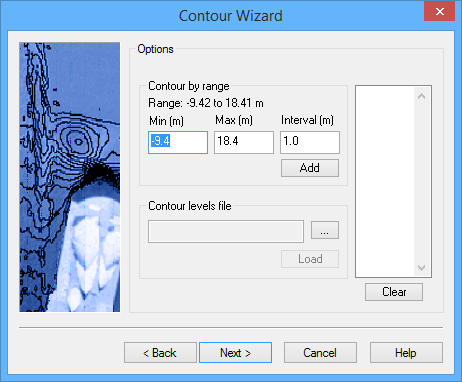 Add | Click to generate the contour levels for the specified range and interval. The list box at the right will be populated with the contour levels. |