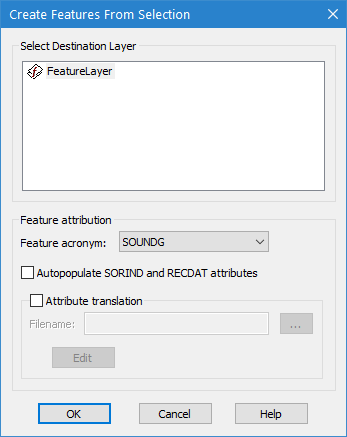 The feature object acronym to use to create the new features. The drop-down list for this field is populated according to the feature catalogue of the selected destination layer. The default selection will be the first sounding type feature in that catalogue.