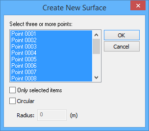 You may also create circular surfaces in your reference model. Circular surfaces are defined by a centre point and a radius value. All circular surfaces are horizontal (at a single elevation).