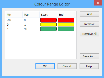 If you chose the Edit option, the colour ranges of the selected file are displayed in the window. Clicking OK will overwrite the existing file with the new changes. Alternatively, you can select to create a new file using Save As. If you chose the New option, the window is empty and a new file will be created.