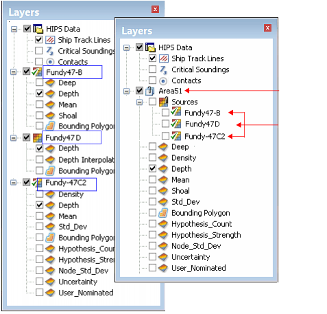 Grouped surfaces are listed together under a new Sources layer, followed by their combined attribute layers, as in the example below.