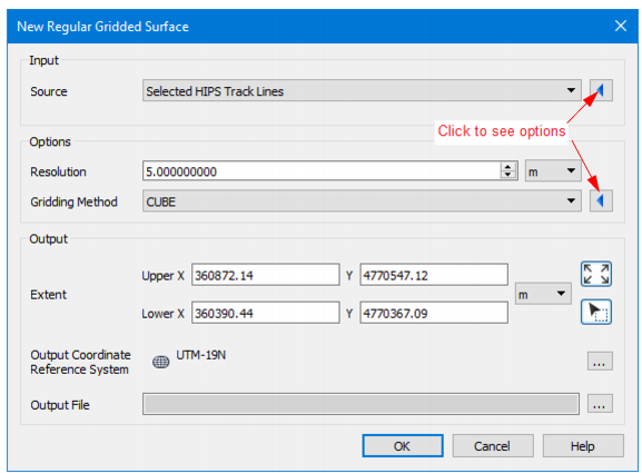 The New Regular Gridded Surface dialog box is structured to hide fields that are optional for the creation of a surface. These options can be displayed by clicking the blue arrows at the right of the dialog box. Options vary with the choice of gridding method.