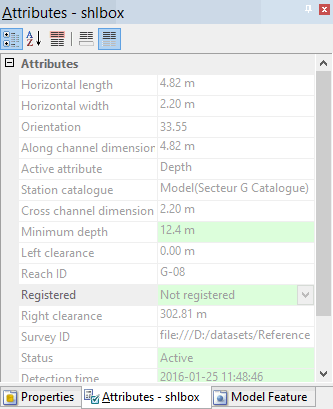 Different attributes will be displayed depending on whether you have a shoal area or a shoal box selected. Shoal area attributes include the reference depth range for the shoal area. Shoal box attributes provide all information about the shoal box, such as: