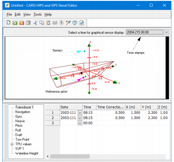 Sensor data is displayed in a table below the 3D vessel outline. This data can be edited.