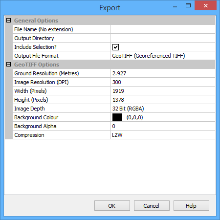 • GeoTIFF • TIFF • PNG | Background Alpha | (This option is only available when the Image Depth is set to 32-bit RGBA). Set the degree of transparency applied to the background colour. The default setting is zero transparency. |