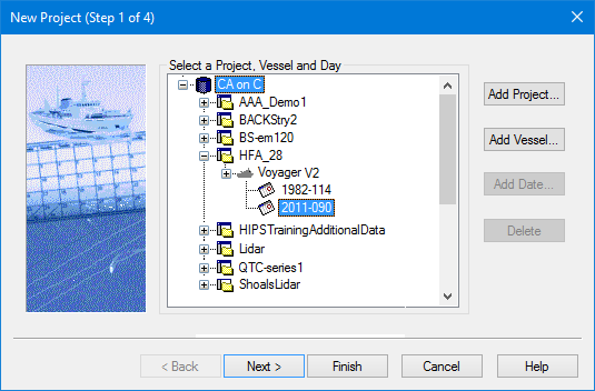 If you select an existing HIPS file (*.hips), and add a new vessel or day, the Finish button is displayed at this point. The original project parameters will be applied (set when the HIPS file was first created).