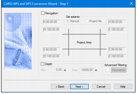The HIPS converter for reading Klein SDF data files has been enhanced to read the bathymetry data from the Klein data format 5000 V2. As a result of this enhancement, the filtering capabilities in step 5 of the Conversion Wizard are now enabled for this conversion. These settings are functional only for the format 5000 V2 data, as no other formats processed by the SDF converter currently contain bathymetry. |