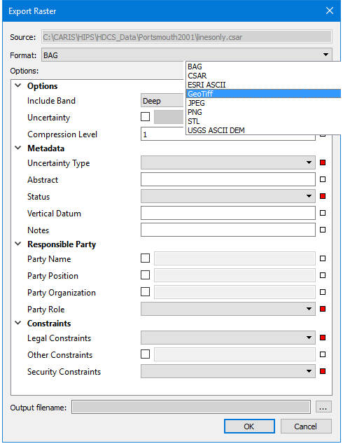 Options | The options for the selected output format. The available options will differ based on the selection in the Format drop-down list. If you hover the mouse cursor over the name of an option, a brief description of the option is displayed in a tooltip. If the BAG format is selected, options are also provided for the BAG Metadata. |