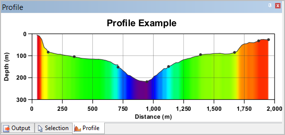 The Profile window is used to display a profile graph to represent an area of bathymetric data. By default, this window is docked with the Output and Selection windows.