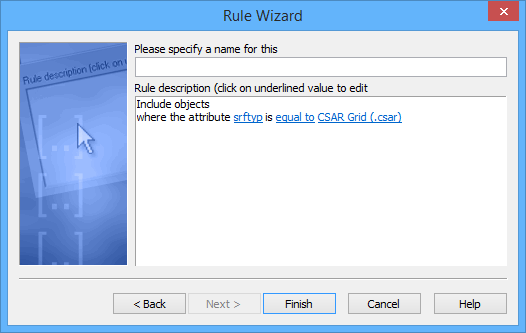 Next, edit the inputs for the rule. For example, to include only CSAR Grid layers, select to include objects where the attribute srftyp is equal to 6.