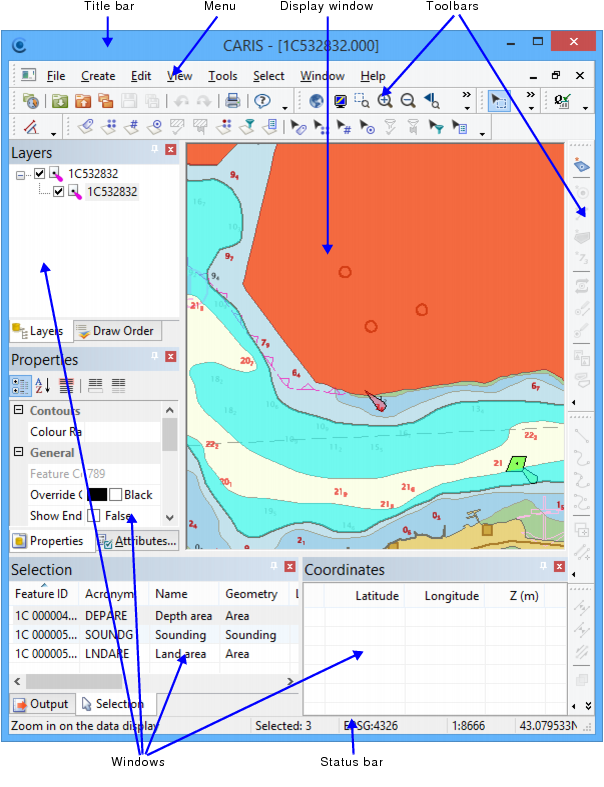 The main window shows a set of commands and windows available in Teledyne CARIS applications.